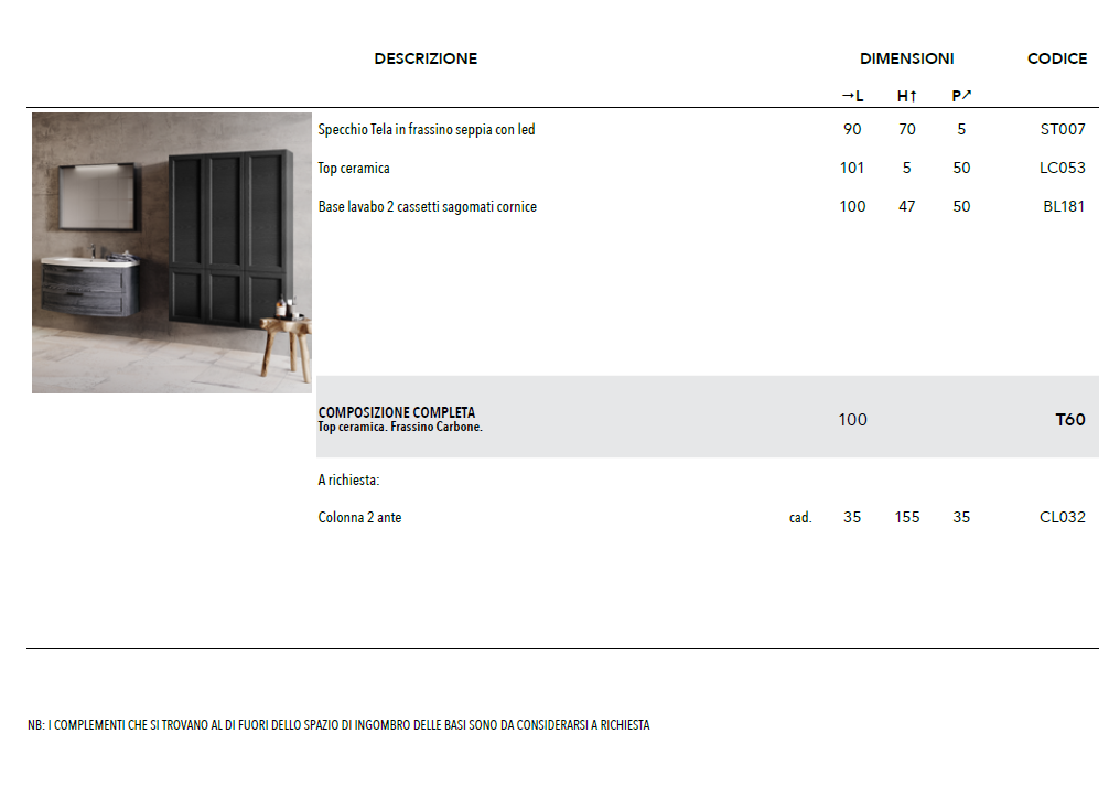 T60 - COMPOSIZIONE COMPLETA 100 cm Top ceramica, Frassino Carbone composta da: Specchio Tela in frassino seppia con led 90x70x5 Top ceramica 101x5x50 Base lavabo 2 cassetti sagomati cornice 100x47x50 A...