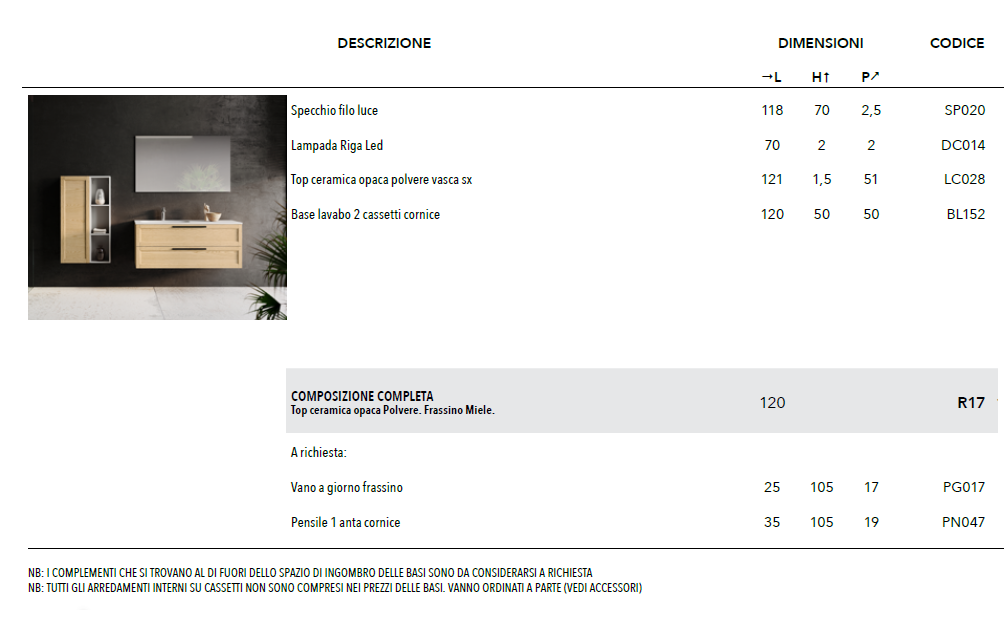 R17 - COMPOSIZIONE COMPLETA 120 cm Top ceramica opaca Polvere, Frassino Miele composta da: Specchio filo luce 118x70x2,5  Lampada Riga Led 70x2x2  Top ceramica opaca polvere vasca sx 121x1,5x51 Base lavabo...