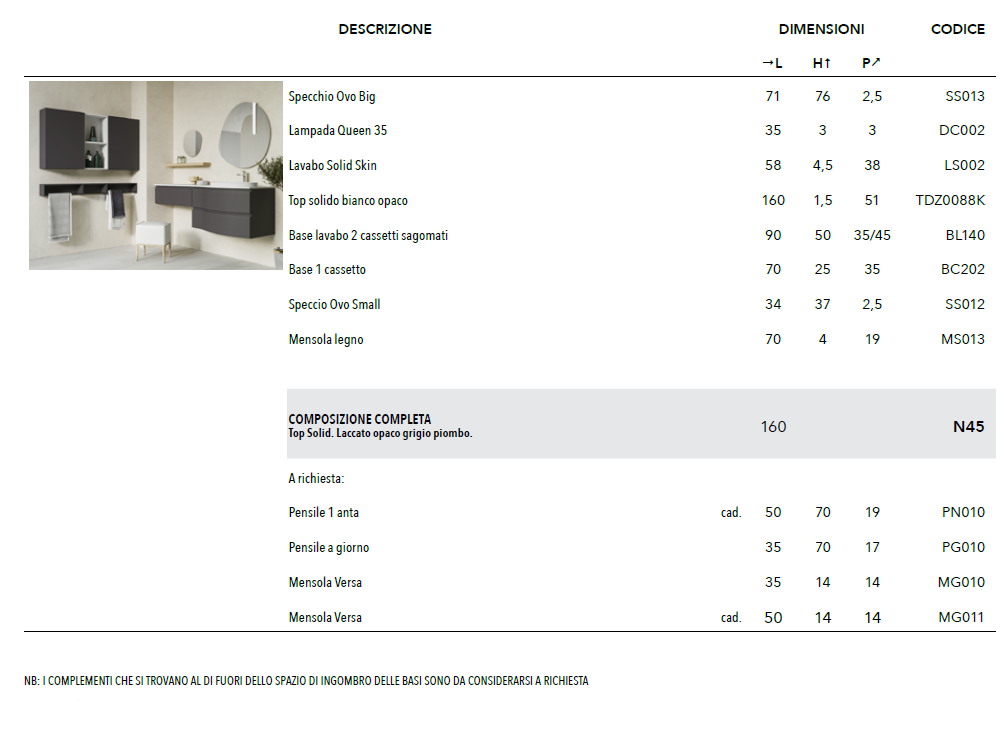 N45 - COMPOSIZIONE COMPLETA 160 cm Top Solid, Laccato opaco grigio piombo composta da: